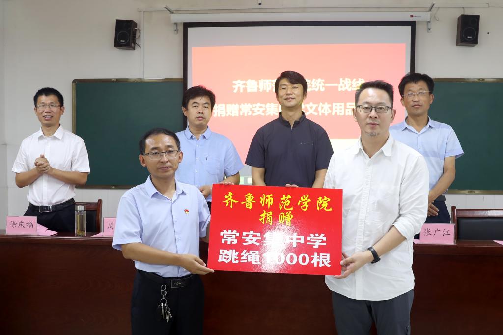 经过两个小时的路程,一行人先来到了夏津县雷集镇常安集中学。上午10时,捐赠常安集中学文体用品仪式开始。杨三军代表统一战线向安集镇中学捐赠跳绳1000条、铅笔500只、书籍读物一百余本。宋新刚讲述了捐赠活动的缘起和经过,从历史和现实的角度、局部和全局的维度阐述统一战线担当使命、发挥优势,关注乡村基础教育和美育的现实意义。杨三军以美术志愿服务参与者的角度,回顾了与夏津县乡村基础教育的结缘与合作的过往,并就进一步合作的诸多细节提出了建议。教体局副局长周忠理、镇学区主任徐庆福、常安集中学校长任新军分别致答谢词,代表安集镇中学的孩子们,对齐鲁师范学院统一战线表示衷心的感谢,并对未来的合作发展表达了美好的期望。